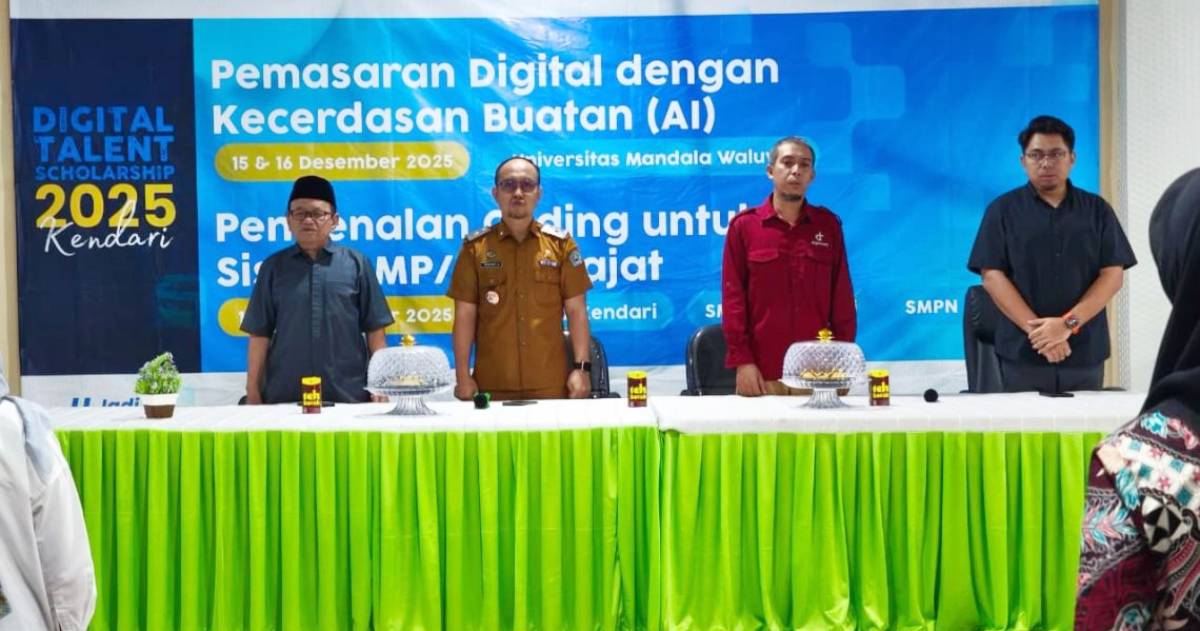 Kadis Kominfo Kendari, Sahuriyanto, membuka DEA Pemasaran Digital dengan AI Batch XXI. Pelatihan ini diikuti oleh 35 peserta dari berbagai latar belakang, termasuk UMKM, mahasiswa, dan masyarakat umum. (Istimewa) IDNkendari.com, Kendari–Kepala Dinas Komunikasi dan Informatika (Kominfo) Kota Kendari, Sahuriyanto, membuka kegiatan Digital Entrepreneurship Academy (DEA) Pemasaran Digital dengan Kecerdasan Buatan (AI) Batch XXI Kota Kendari. Kegiatan ini digelar di Universitas Mandala Waluya pada Senin, (15/12/2025), sebagai bagian dari program penguatan kapasitas pelaku usaha dan sumber daya manusia di bidang digital.